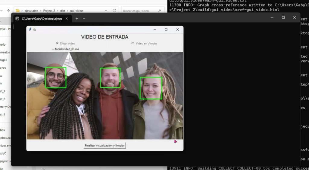 Entonces estamos indicando con –icon que usaremos la imagen icono.ico como ícono para nuestro ejecutable. Con –add-data agregamos archivos de datos (en este caso el detector facial) que necesita nuestro programa para poder funcionar. Finalmente, ubicamos ./gui_video.py que es nuestro programa principal.