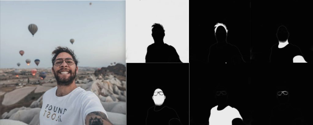 De hecho, si empezamos por la sección superior izquierda, a la derecha de la imagen de entrada tenemos: máscara de confianza del fondo, cabello, piel del cuerpo. Mientras que en la sección inferior tenemos a: máscara de confianza de la piel de la cara, ropa y los accesorios, en este caso, los lentes.