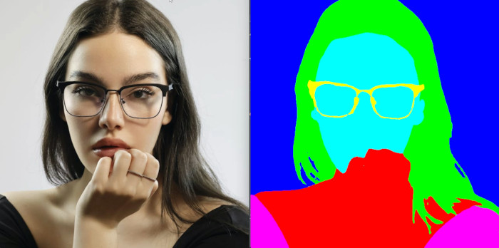 A la izquierda tenemos la imagen de entrada, mientras que a la derecha, la imagen segmentada. Podemos ver que el fondo se ha coloreado de azul, el cabello de verde, la piel de la cara de celeste, mientras que la piel del cuerpo de rojo, la ropa de rosa y los accesorios, en este caso los lentes de amarillo. Y esto es precisamente lo que haremos en este tutorial, vamos a identificar las diferentes regiones y colorearlas.